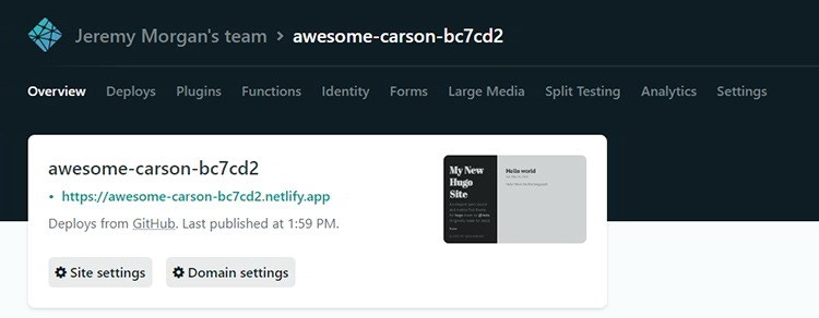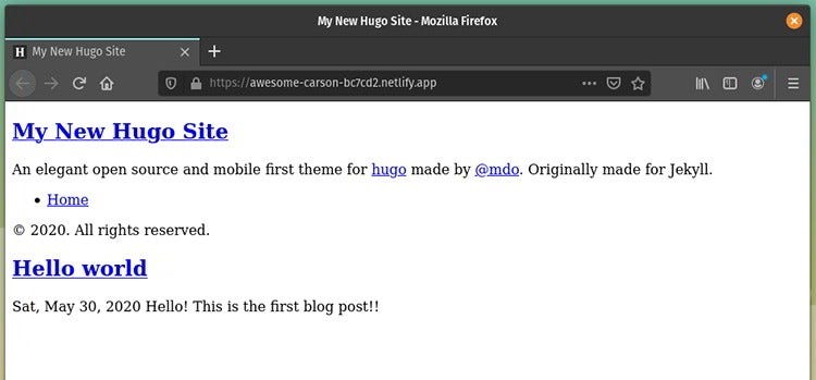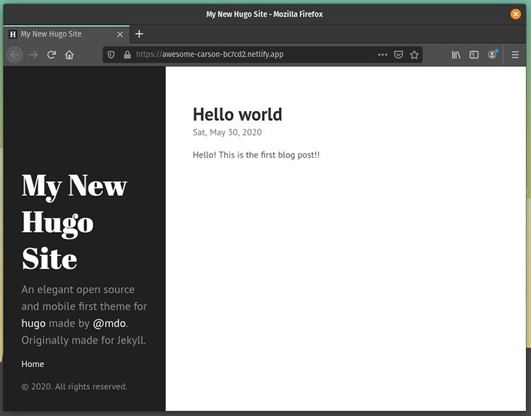baseURL = "https://awesome-carson-bc7cd2.netlify.app/"languageCode = "en-us"title = "My New Hugo Site"theme = "hyde"And I will add it then commit. Now my site looks like this: