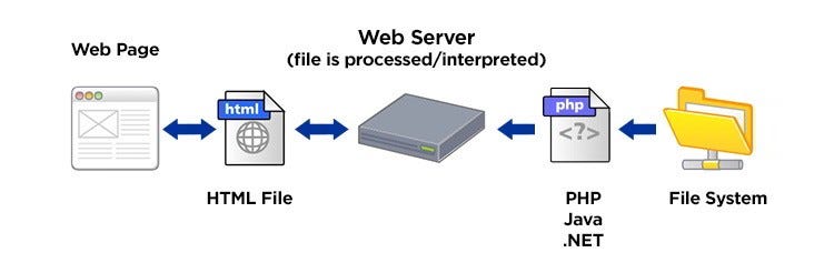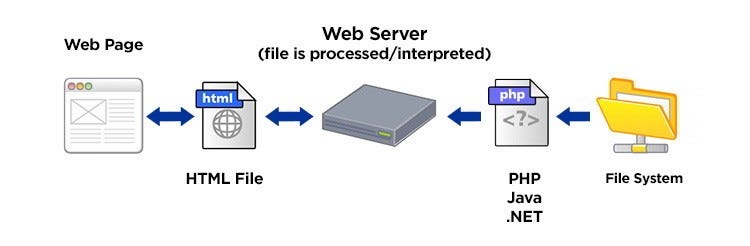 This is how the web began. Since the webserver is just pushing out HTML files with no processing, they’re extremely fast. The downside is they can’t be changed. No matter what data changes, the HTML files are the same. You can’t dynamically update a page when data changes.