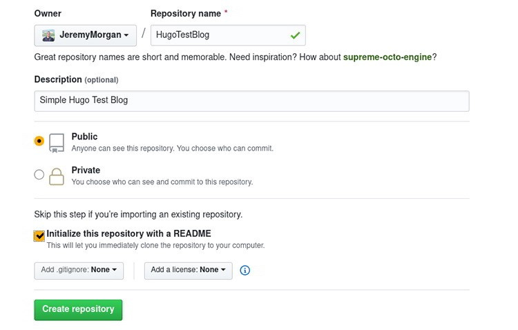 git rm --cached themes/hydegit submodule add https://github.com/spf13/hyde themes/hydeNow, head to Github and create a repository.